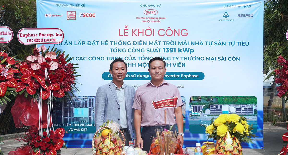 Lễ khởi công dự án Điện Mặt Trời Mái Nhà Tự Sản – Tự Tiêu (C&I Rooftop Solar) với sự tham dự của đại diện Alena Energy và Tổng Công ty Thương mại Sài Gòn (SATRA), dự án có tổng công suất 1.391 kWp.