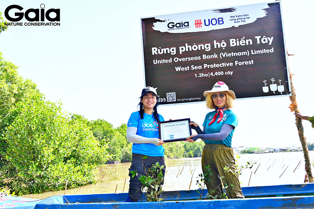 Bà Huyền Đỗ – Nhà sáng lập & Giám đốc Trung tâm Bảo tồn Thiên nhiên Gaia trao giấy chứng nhận cảm ơn cho đại diện công ty UOB Việt Nam trong dự án trồng 4400 cây tại Đê Biển Tây.